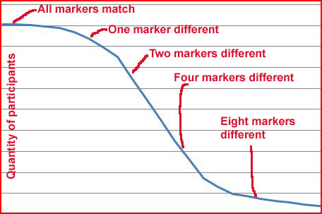 The majority of participants would have the same markers as their ancestor. Many, but fewer would have 36 of the 37 match. Many, but even fewer, would match on 35 of 37 markers. The number of participants with even more mismatches will decrease quickly. We might even find a participant who mismatched by six or eight markers. We might find that 60% of the participants had perfect matches; that 80% had 0 or 1 mismatch; that 95% had 0,1, or 2 mismatches; that 98.5% had 0, 1, 2, or 3 mismatches; that 99.99% had 0, 1, 2, 3, or 4 mismatches. But there might be one participant who had 8 mismatches. His numbers would be called an "outlier". Typically, we would say that 6 or more mismatches indicate that participants don't share a common ancestor. However, remember the possibility of outliers, when you are comparing mismatches of 6-10.